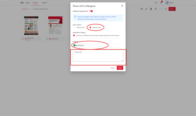 You can also share by email. Add in the email address or addresses of the colleagues you would like to share your collection with. Add a note if you want to.