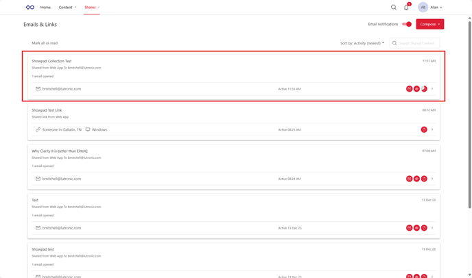 To check the history of activity, go to the Shares tab and click on Email & Links.